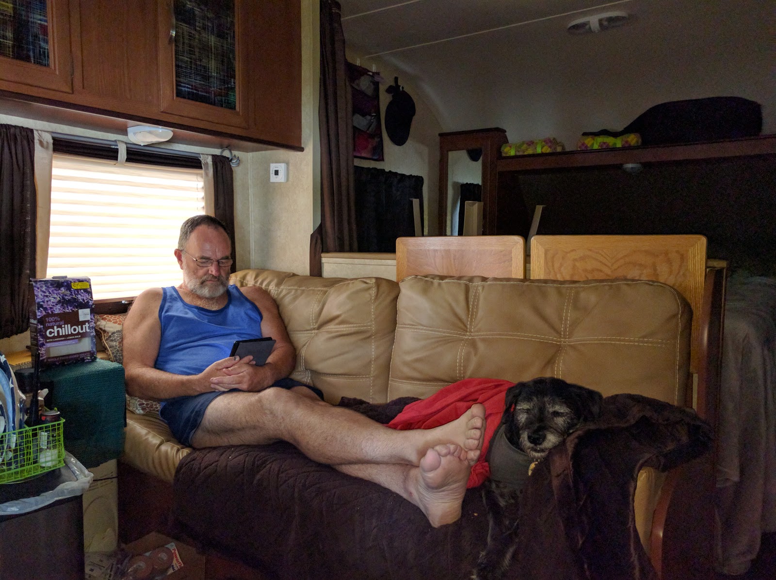 I know you definitely want to know how I managed a cake...oh, and biscuits to go with sausage gravy, and make do garlic bread from leftover slider rolls, and the leftover biscuits again...well we broke down (which means I wanted it) and bought a small toaster oven with "convection turbo fan." It's sitting outside the camper, on one of the wooden TV trays I was smart enough to wedge behind the couch, used daily! This morning I got to have real toast, 😱. Anyway, it will be a plus on this trip, I'm sure. Hoping for a grits casserole for Wednesday breakfast, we'll see how industrious I feel.