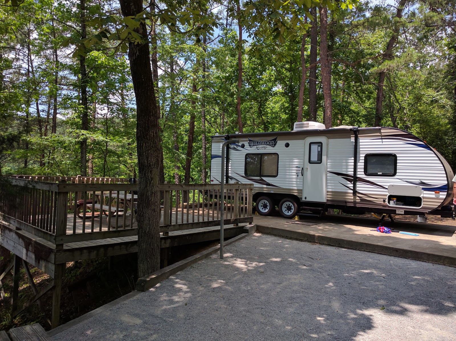 This is a beautifully designed campground, with most sites on a hillside, with 1-2 decks for eating, grilling, etc. RV pads are all paved, level front to back with a slight grade side to side to accommodate water. You can tell they've all been reworked from originals, with even the walking and paved bike trails updated. Now if only they'd think about spa type bathhouses..ok, wishful thinking. Even I'd balk at parks spending tax dollars that way...unless they were charging accordingly. Wonder what a park service run spa might be like? I'd be game to pay for a day or even a week .
