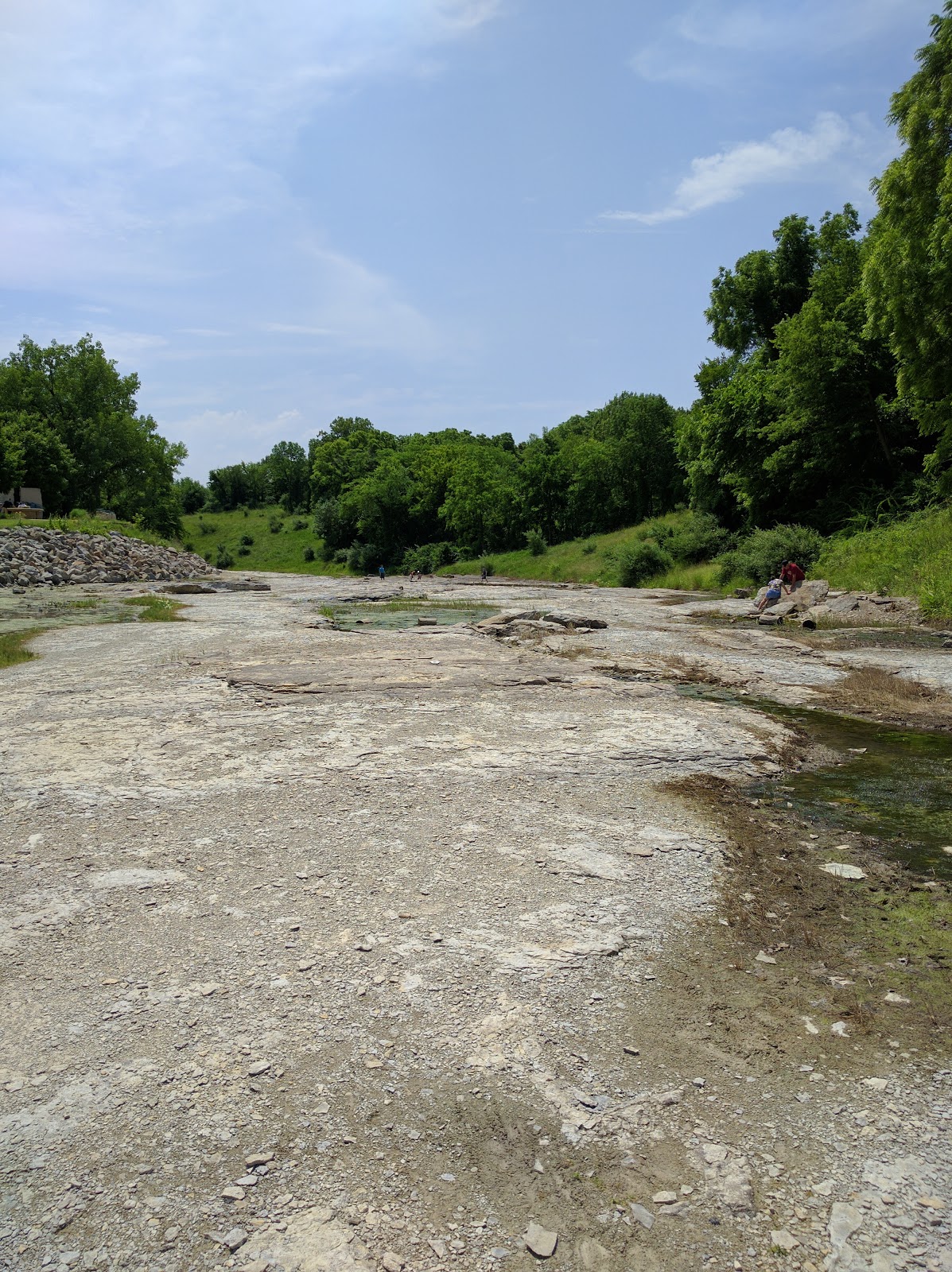 375 million years ago, this area was a tropical marine environment. It was south of the equator and covered by warm, shallow seas similar to the Caribbean Sea today. This was the Devonian period, part of the Paleozoic Era and more than 200 million years before dinosaurs. Later the continents broke apart and multiple geological events shaped the Iowa of today, including the Iowa River. When the Coralville Dam was completed in 1958, upstream from Iowa City, it was primarily for flood reduction on the Iowa River, and has been successful in that respect but for the exceptional years of 1993 and 2008. In 1993, Coralville Lake exceeded its capacity and water poured over the emergency spillway for 28 days straight, washing away a campground, a road and removing 17 feet of soil and rock...exposing the Devonian bedrock that became the Devonian Fossil Gorge. In 2008 floodwaters again swept through the gorge, widening it significantly. If you look carefully, you will find numerous fossils embedded in the rock surface, ranging from coral heads to crinoids and brachiopods. This gorge is a transient thing though. The limestone surface exposed by the floods had been protected from the elements by a layer of sediment, and now that it is exposed to the elements, the rock weathers. Freezing and cooling flake the rock surface, acid rain blunts the sharper features, and vegetation has found footholds in cracks in the rock.These natural processes are unavoidable; they apply to any exposed limestone surface. And of course, having thousands of visitors walking on it, touching the fossils, etc continues the degradation. In the fifteen years after the flood of 1993, weathering, plant growth and foot traffic apparently obliterated many of the fossils exposed in that first flood. The flood of 2008 renewed the gorge, but again, it is only temporary. Today, as my pictures show, nature is regaining her foothold.