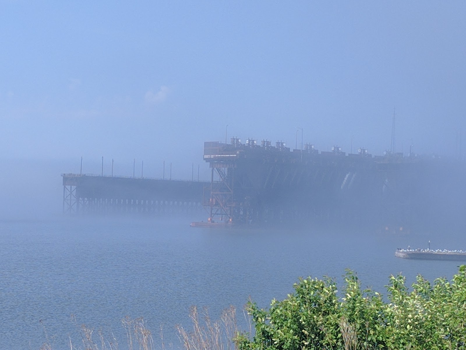 Back in Two Harbors, we watched the COE tow several barges full of big rocks into Agate Bay, nestling up next to one of the ore loading docks. Have no idea what they will be used for as we left the next morning, but maybe to add to bay breakfront? Additionally, we saw one of the ore boats, the Mesabi Miner, come into that same bay, again a real art of maneuvering, especially since the bay is actually very small. Wind was blowing a good 20-25mph also - hard on pictures, and even harder on that captain. If you enlarge the picture to the left, you can see the ore boat, the ore docks and on the right of the right dock...the COE tug and barges, tucked out of the way.OK, laundry's done..need to fold and get it back to the trailer. Then lunch and get ready to go on our NPS tour in Voyageur National Park to Kettle Falls .Au Revoir mes Amis.